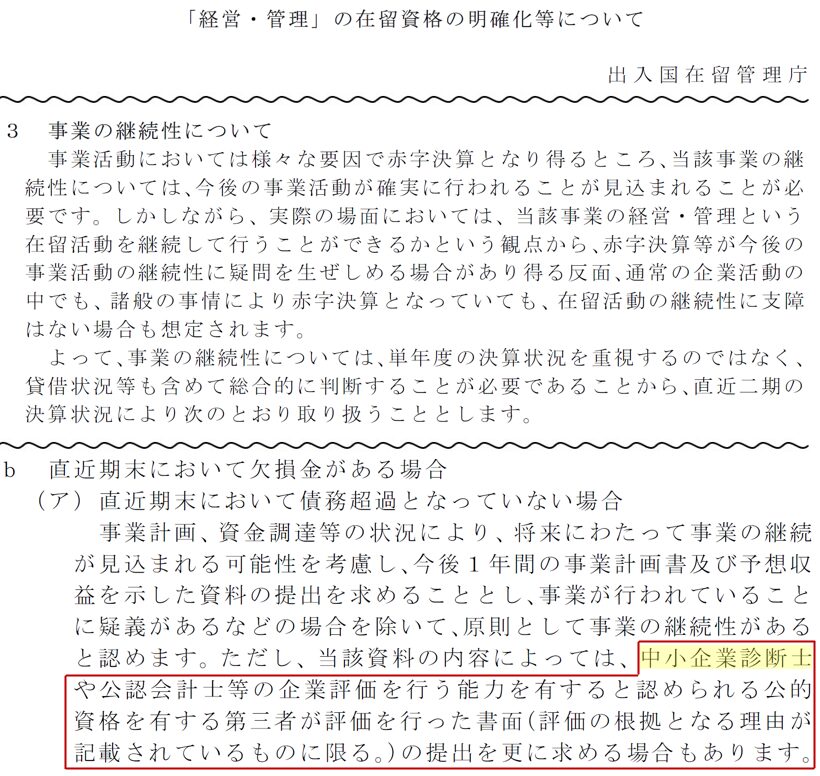 経営ビザ(在留資格「経営・管理」)において、赤字決算・債務超過・売上総利益がない場合には、中小企業診断士による第三者評価書の提出が求められるケースがあります。